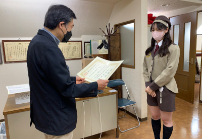 コロナ禍のため授賞式は中止となりましたが、目黒区長に代わって自由が丘商店街振興組合 原 武理事長より、学生へ感謝状を手渡していただきました。