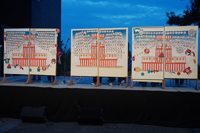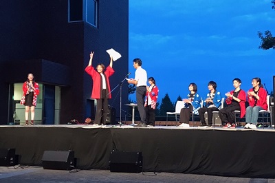 やぐらを模したポスターに、学生の想いを綴った提灯型の用紙が貼られた「納涼ひとことやぐら」は予想外の数が集まり、閉会式では壇上いっぱいに広げての披露となりました。