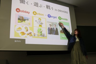 経営学部では、新入生が北海道帯広市役所の職員になりきり、ふるさとワーキングホリデー企画を提案する課題に取り組みました。産業能率大学の学生向けに、心惹きつける様々なプランを企画・発表しました。