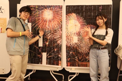 「納涼ひとこと花火」と題し、学生各々の思いを記入した用紙を並べると花火の絵になるという企画では、想定以上のコメント数が集まり、掲示板にはメッセージの花火が咲きました。