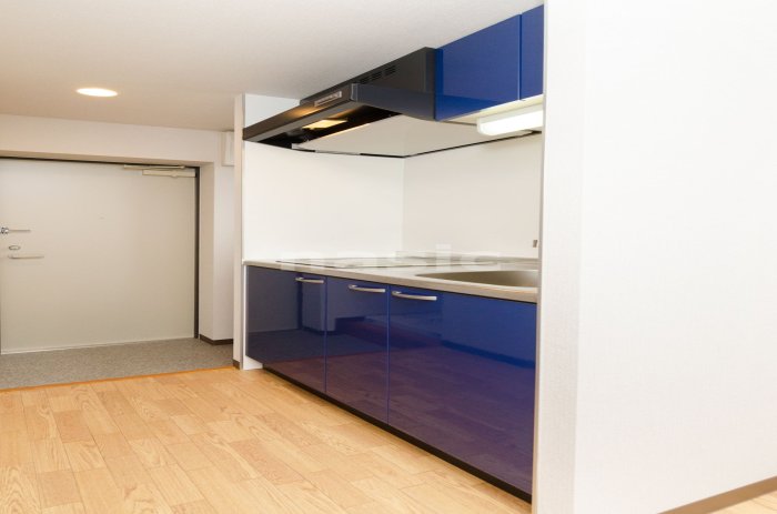 ブルー中心のワイドなキッチン