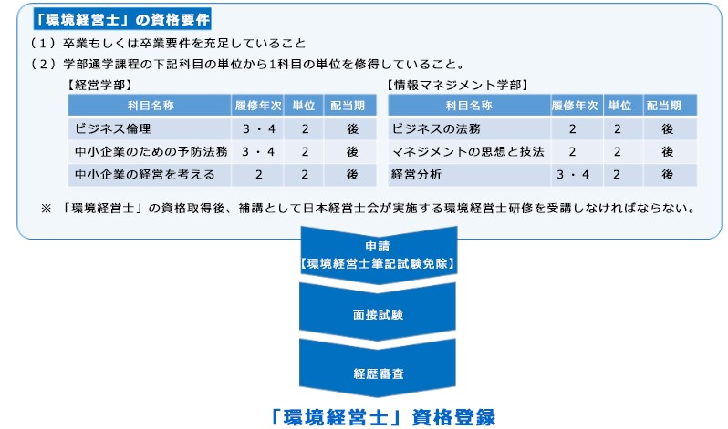 本学は、一般社団法人日本経営士会と協定を結び、通学課程ならびに通信教育課程の指定の科目単位を修得すれば、准経営士補の資格付与、または環境経営士・経営士補の資格試験の一部が免除され、資格の取得が有利になります。この資格を取得すると経営コンサルタントへの道が開けます。