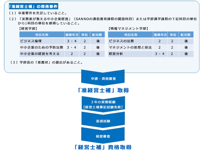 「准経営士補」は、経営士補に準ずる経営管理の専門知識を有する4年制大学(経営学部・経済学部等)の学生で資格要件を満たした学生に付与されます。