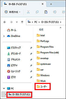 2.【ローカルディスク(C:)】をクリック、【ユーザー】をダブルクリック