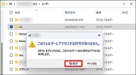 4.このフォルダーにアクセスする許可がありません。と表示されるので、続行をクリック