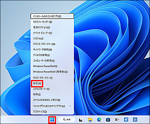 1.「スタート」を右クリック、表示されたメニューから「設定」を選択。