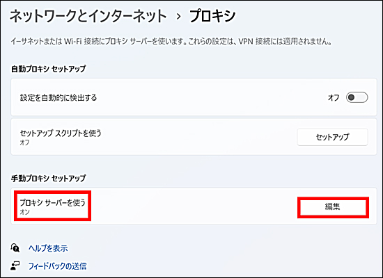 3.プロキシ サーバーを使う「オン」になっている場合は、編集をクリック。オフの場合は設定変更は不要