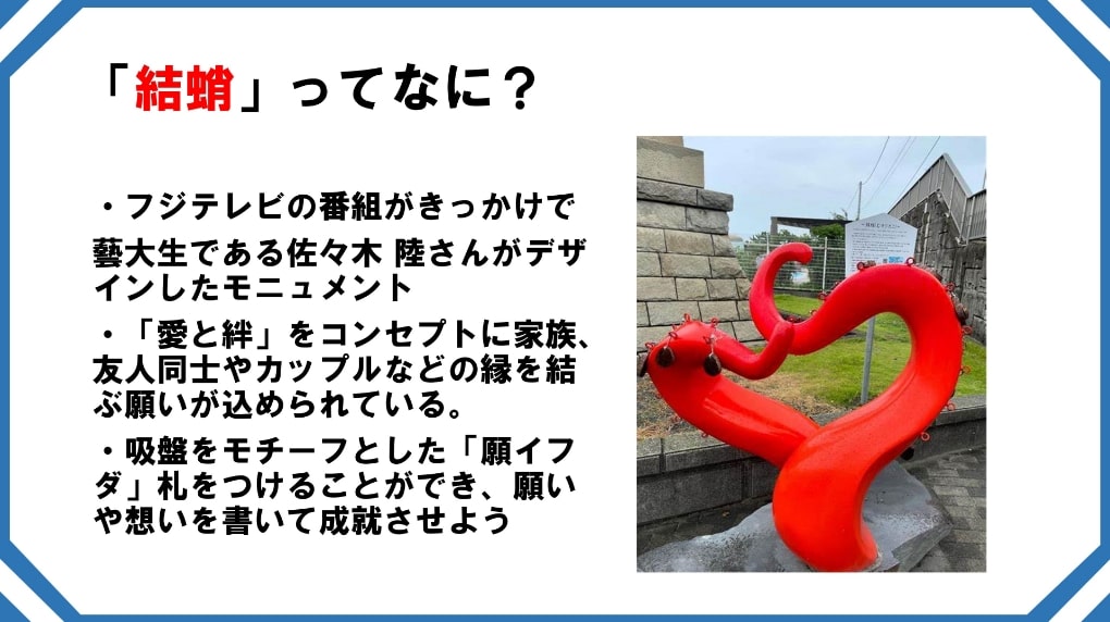 大磯町役場と連携し、観光資源の探索と魅力の発信に取り組んでいます。2024年度は「結蛸」を題材とした町歩きのためのプランを提案しました。フィールドワークを通じて若者を対象としたPRプランを考えました。また、「大磯まつり」の来場者アンケートの作成と実施、データ分析を行って大磯町の観光振興に貢献しました。