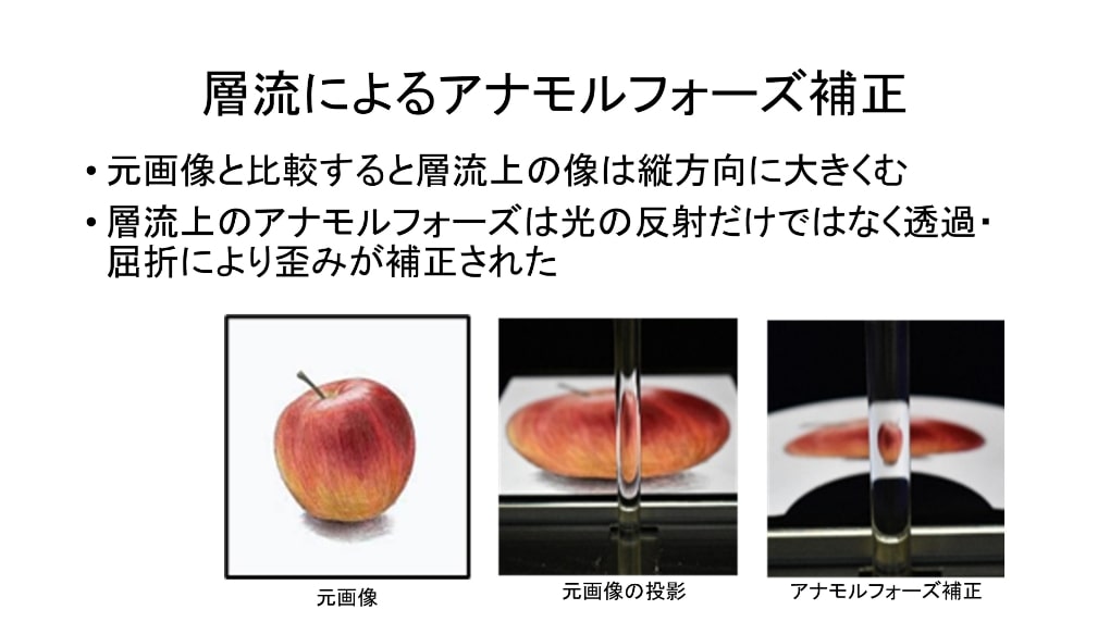「層流」と呼ばれる安定した流れをディスプレイとして活用し、アナモルフォーズと呼ばれる歪んだ絵を正常な形状に表示する研究です。