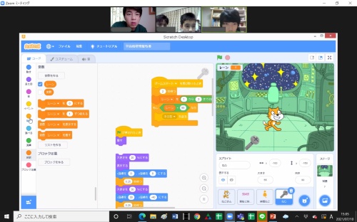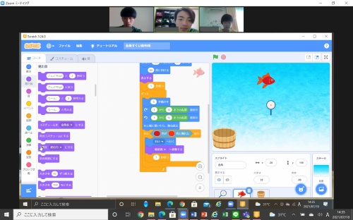 7月10日(土)にオンラインワークショップを開催し、伊勢原市内の小学4~6年生16名がZoomで参加しました。参加者は学生から説明を受けながら「金魚すくいゲーム」「宇宙船修理ゲーム」の制作に取り組みました。経験者も多く、自分でアレンジを加えて楽しみながら作品作りを行ってくれました。