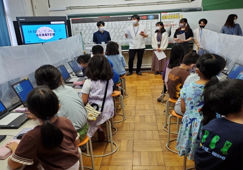 情報マネジメント学部北川博美教授のゼミでは、地域の小学生を対象に教育用プログラミングツール「Scratch」を使用したプログラミング体験ワークショップを開催しています。
