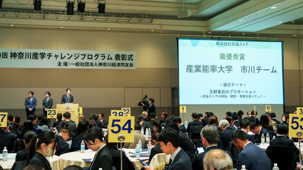 「産チャレ」に挑む「産チャレ」は、神奈川県下に拠点を持つ大学と経済同友会会員企業・団体が協力して実施する産学連携プログラムです。学生チームが企業の経営課題に対する解決策を研究レポートとして提出し、企業が審査します。調査やフィールドワークを経て30ページのレポートを作成し、合格すれば企業でプレゼンを行います。レポートとプレゼンの評価が認められると、パシフィコ横浜での表彰式に参加できます。