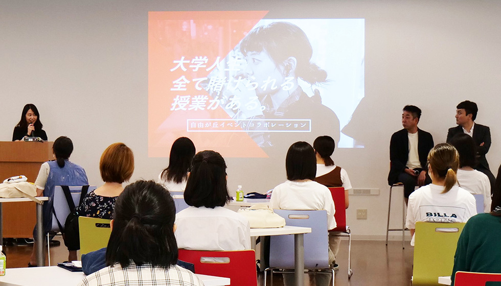 8月1日(土)のSANNOのオープンキャンパスにて、「自由が丘を舞台にした本気の授業」というテーマでスペシャルプログラムを実施。大竹さんがMCを務め、西村氏、古山氏をゲストに履修生とトークライブを行いました。その他、この日のために制作したPRムービーやスイーツプロモーションの講師スーパーパティシエ 辻口 博啓 氏のメッセージ動画も放映し、自由が丘とのコラボレーションの魅力を紹介しました。