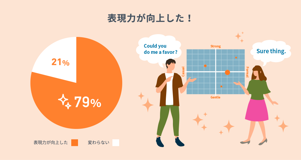 - ●「表現レーダー」(※)を使うことで英語の細かなニュアンスの違いや表現の違いを学べたので、一気に語彙や会話の幅が広がりました。