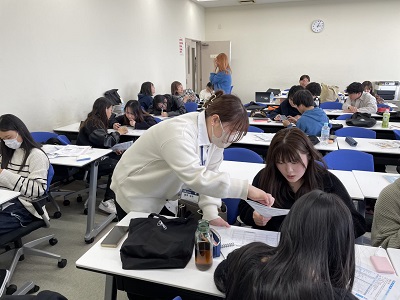 新入生の「オリエンテーションプログラム」の初日は、授業に参加する前に行う事務手続きがいくつもあり、慣れない作業に戸惑うことが予想されたため、Sharesがサポートを行いました。住所登録や、出席確認、履修登録などの手続き方法だけでなく、自らの経験をいかし履修科目の相談にものりました。