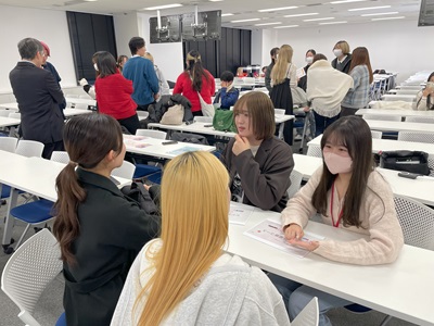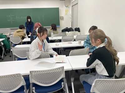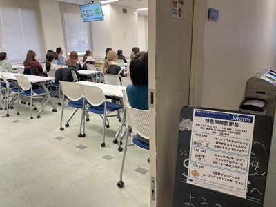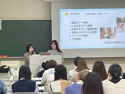 4つのコース(グローバルコミュニケーション、ビジネスリーダー、ホスピタリティ、ビジネス経営)ごとに資料を作成し、コースの学びの特徴や、得られる力などを説明したのち、各コースに所属しているSharesの2,3年生が個別の相談に乗りました。
