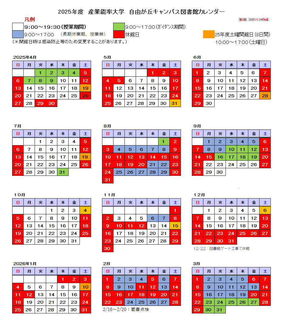 図書館カレンダー|自由が丘キャンパス