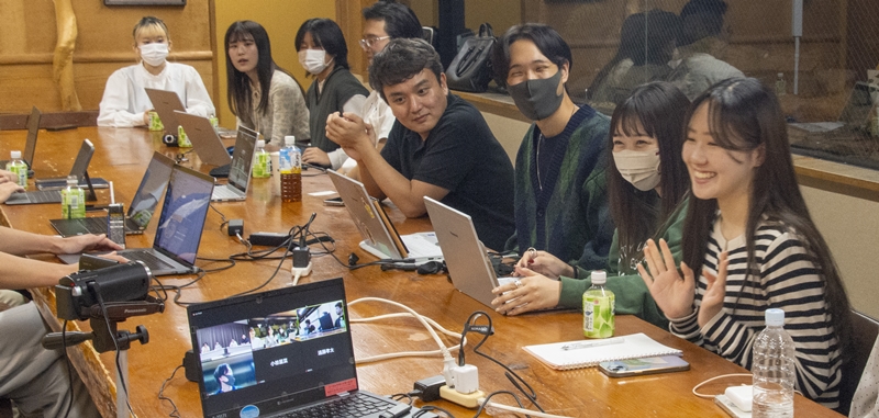 自由が丘商店街振興組合の会議室からオンラインで参加した学生達