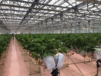 視察では、具体的な顧客のパーク内での動きなどを観察した(図2)。例えば、駐車場に駐車している車のナンバープレート、車種からどのようなエリアから来園しているか、生活水準などを推察しながら観察したり、学生によっては、来園ゲストとの対話を楽しみながら、施設の課題点などをインタビューしたりした。他にも、1年中いちご狩りができる施設(図3)としてプロモーションしているいちご狩りの施設を観察し、他のいちご狩り施設との違いや特徴などを考察した。事前に外部講師による、実践的な調査視点を学んだ上での視察であったこともあり、有意義な視点で調査をすることができた。