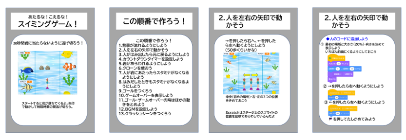 ヒントカードは、だれでも教えられるような資料がほしくて開発した教材だが、ワークショップで使ってみると、Scratchの基本がわかっている子どもの自習教材としても十分使えることがわかった。ワークショップでは経験度に合わせて、複数の教材を準備するのだが、初心者で比較的簡単な作品を作った子どもが、もう少しレベルの高い作品のヒントカードをほしがってくれることも増えた。