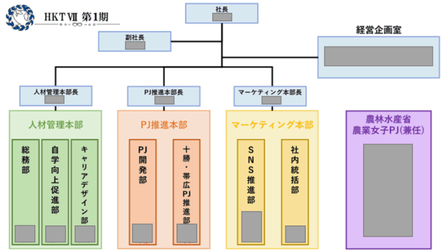 上記に継承していくことの大切さを述べましたが、当ゼミではそれを必然的な形で実行していく仕組みがあります。それはゼミ内を疑似会社化して運営しており、ゼミ内には社長や部長もいて、管理部やプロジェクト事業部などもあります。経営学で学んだ組織運営を実際に必然的な形で学びます。