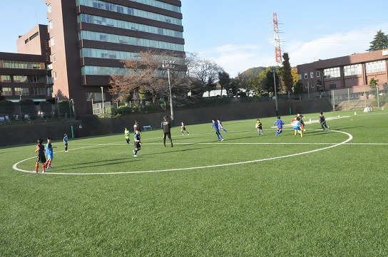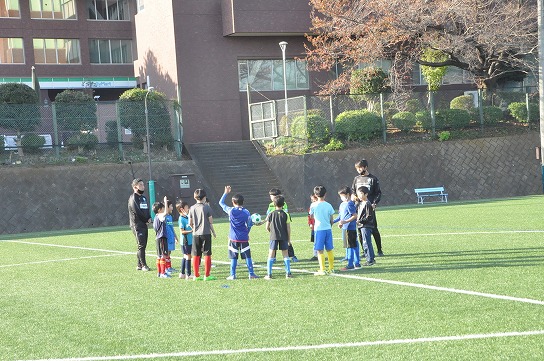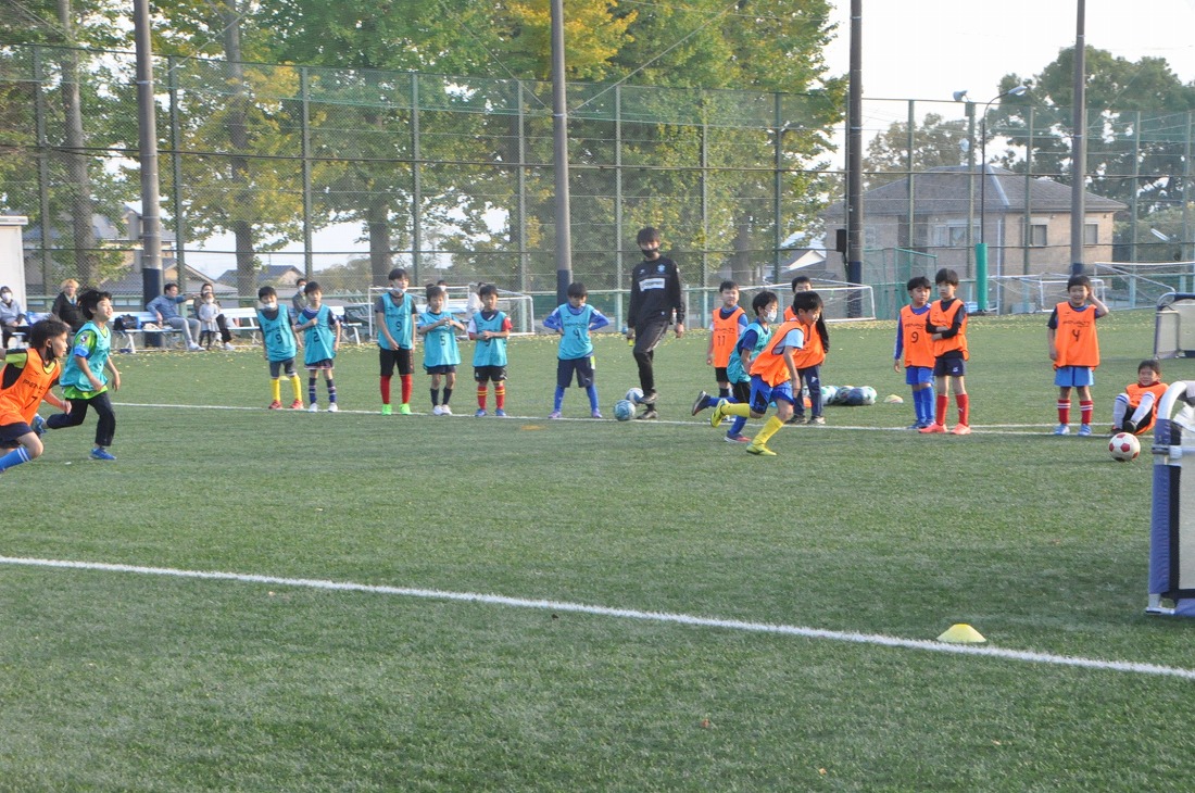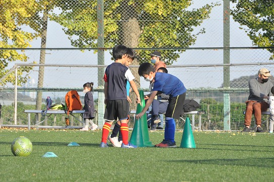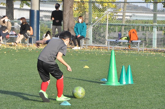 次に4チームに分けてコーンあての練習を行いました。大小のコーンを相手が倒しづらいように設置しどれだけ倒せるかを競いました。コーンを設置する時はどうしたら相手が倒しづらいかをチームみんなで話し合いながら決めました。各チームが時間内に数多くキックできるように工夫もしていました。2回戦目ではコーチからのアドバイスや他チームの工夫を参考にし、どのチームも1回戦目よりもコーンを倒すことが出来ていました。